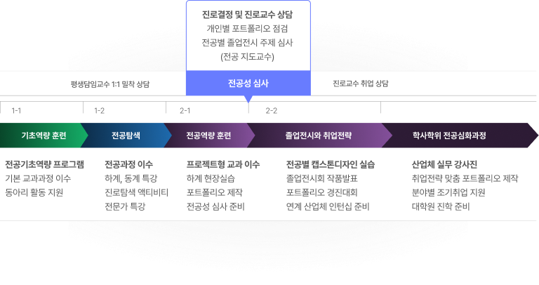 진로교수 및 전공분야 지도교수 상담 및 심사를 통해 개개인의 역량에 맞춰 진로를 선택할 수 있도록 지도교수